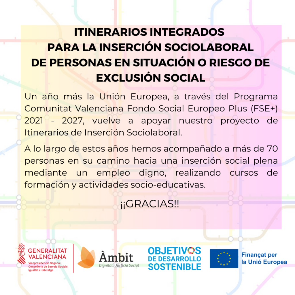 Este programa está financiado por la Unión Europea a través del Programa Comunitat Valenciana Fondo Social Europeo Plus (FSE+) 2021 – 2027 y se basa en el diseño de itinerarios personalizados para cada una de las personas que atendemos. Con ellos pretendemos dar respuesta a sus necesidades y aprovechar sus capacidades, realizando acciones formativas con las que puedan desarrollar las herramientas sociales y laborales necesarias para hacerse un hueco en la sociedad y poder vivir una vida plena y digna.